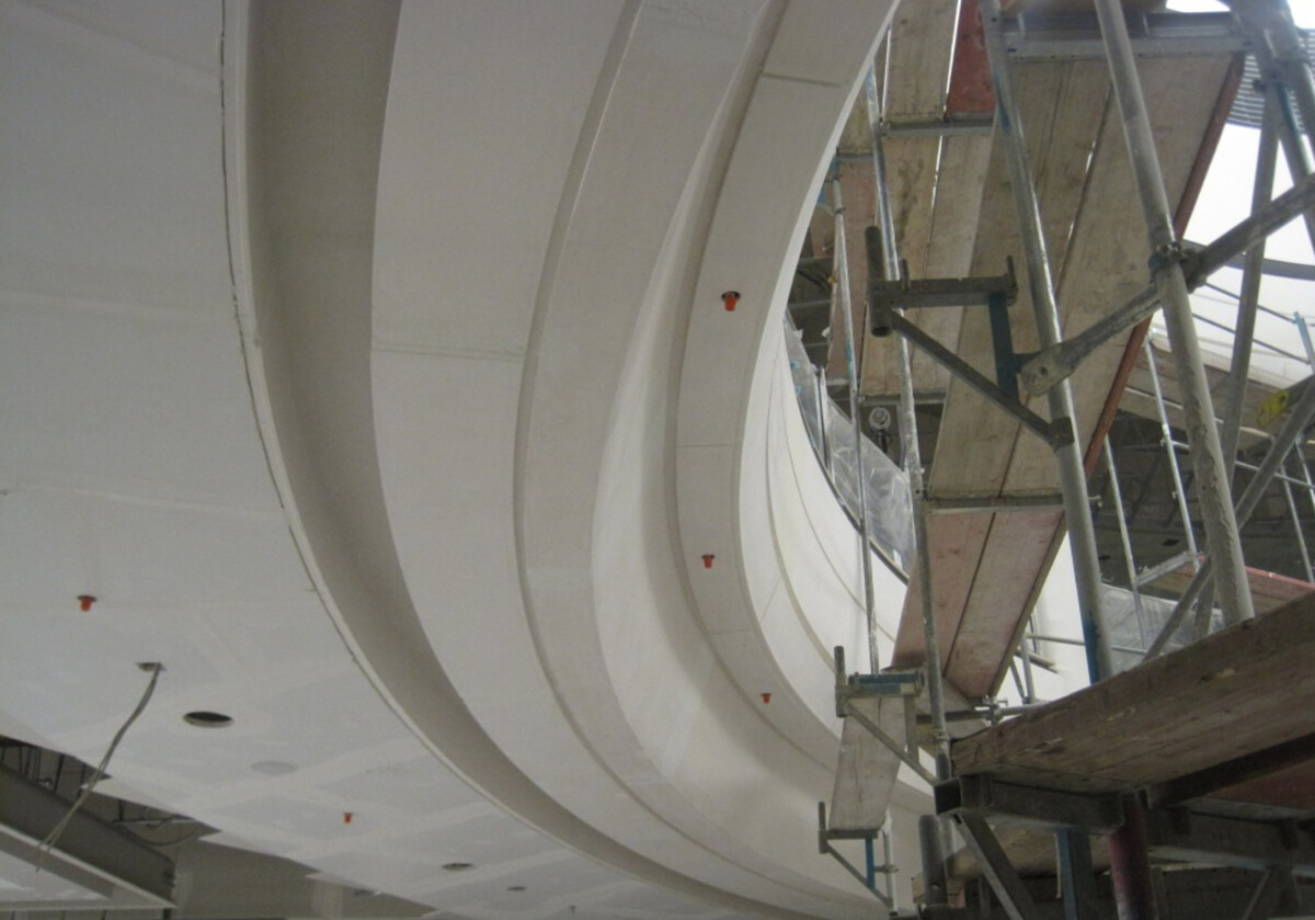 - Die hohe Kunst des Trockenbaus: Dreidimensionale Bekleidungen, gebogene Brüstungen mit sich anschließenden Lichtvouten, vorgefertigte Anschluss- und Eckstücke.