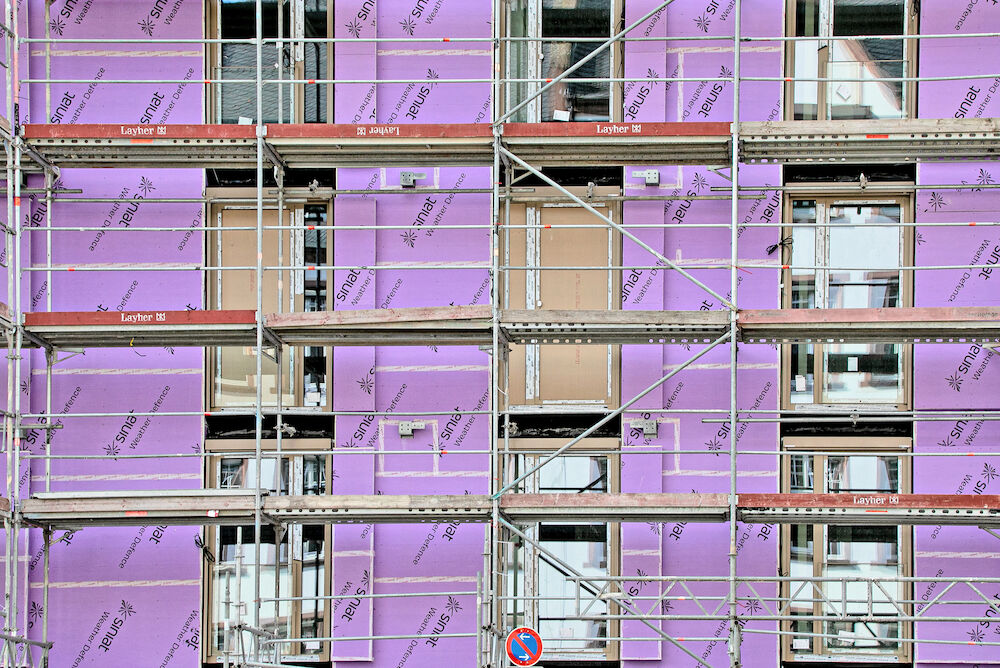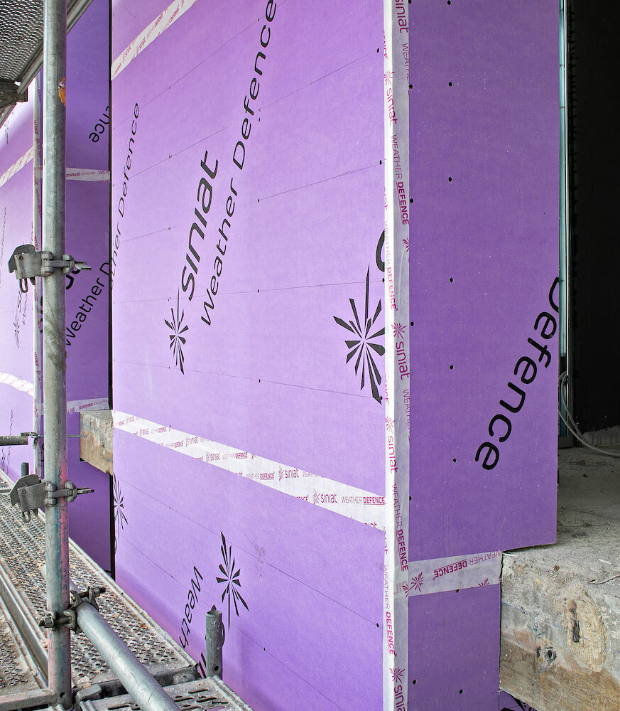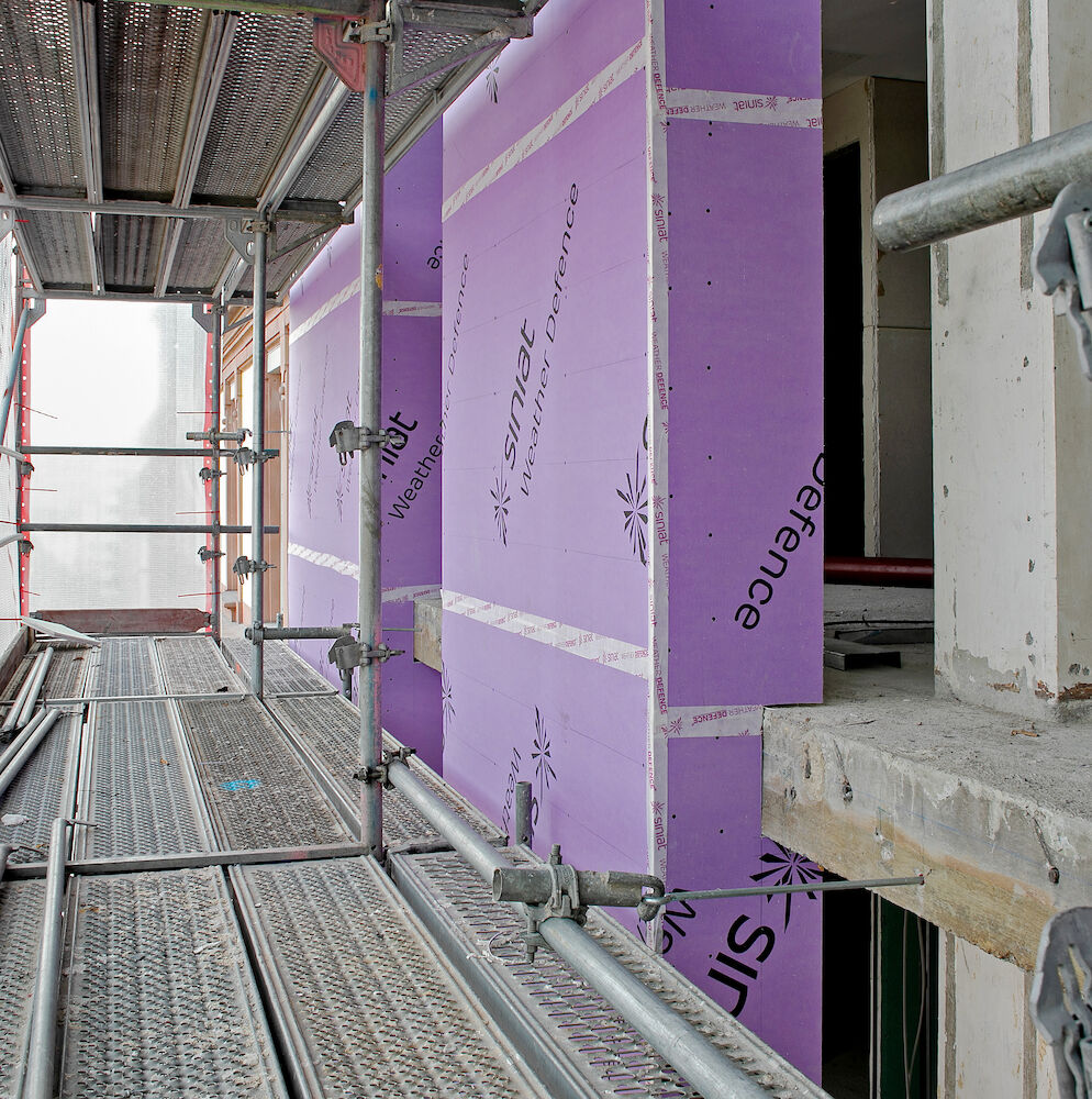 Damit die neuen Wohnräume entstehen können und die zusätzliche Fläche gewonnen werden kann, galt es, eine technische Lösung zu finden. Das Team stand vor der Herausforderung, den geplanten Stahlwinkel im Stahlbeton der Decke zu befestigen. Hierfür kamen spezielle Schwerlastdübel zum Einsatz. Auf die Stahlwinkel wurden anschließend edificio U-Profile mithilfe von Setzbolzen aufgebracht, statt wie gewohnt zu bohren und zu verschrauben. Bevor diese Befestigungstechnik erfolgreich eingesetzt werden konnte, musste im Vorfeld ein statischer Nachweis erbracht werden. Durch fachkundige Berechnungen seitens des Statikers von Siniat und Protektor in Abstimmung mit dem Baustatiker vor Ort konnte die alternative Befestigungsmethode jedoch problemlos durchgeführt werden.In die edificio U-Profile wurden dann die von der Firma Protektorwerk gelieferten edificio C-Profile eingesetzt. Danach wurden die hochwertigen lilafarbenen Weather Defence Platten horizontal in die edificio C-Profile geschraubt. Die Fugen der Platten wurden mit speziellem Fugenklebeband abgedeckt, um die Wasserdichtigkeit und Winddichtigkeit zu gewährleisten (an allen Stoßstellen und im Randbereich). Die finale Oberfläche der Fassade bildeten letztlich Klinkerriemchen. Im Innenbereich kamen LaPlura-Platten zum Einsatz. Es wurde zusätzlich eine 2-lagige Vorsatzschale für das Führen von Leitungen eingesetzt. Die Fertigstellung der Klinkerfassade nahm noch ein paar Monate in Anspruch. Das Gute daran war, dass die Weather Defence über das Versprechen des 6-monatigen Wetterschutzes hinaus sogar wesentlich länger der Witterung standhielt.Diese Tatsache und die Erfahrung der Siniat-Kollegen in Großbritannien bewegt Siniat Deutschland nun dazu, den Wetterschutz mit der Weather Defence auf 12 Monate auszuweiten. Nach Fertigstellung der Außenfassade war das Projekt erfolgreich abgeschlossen.