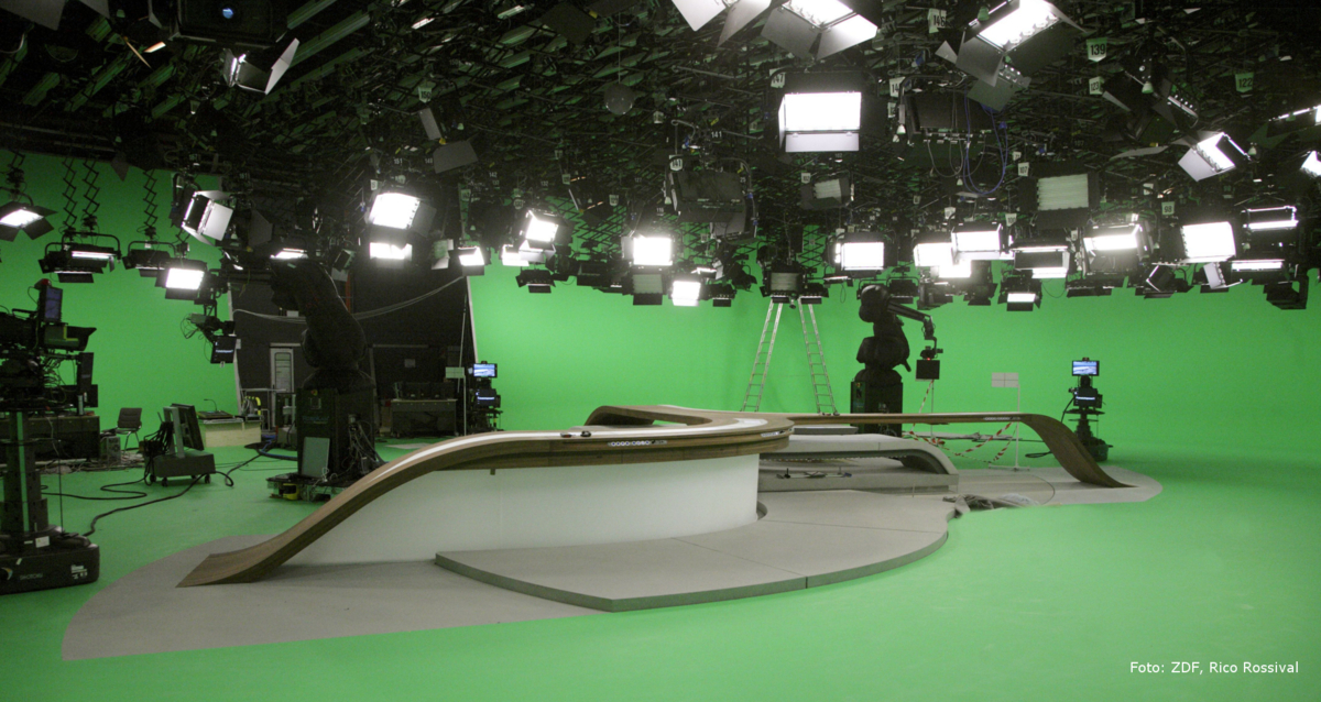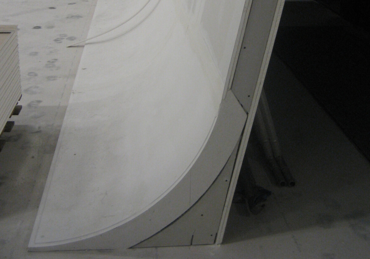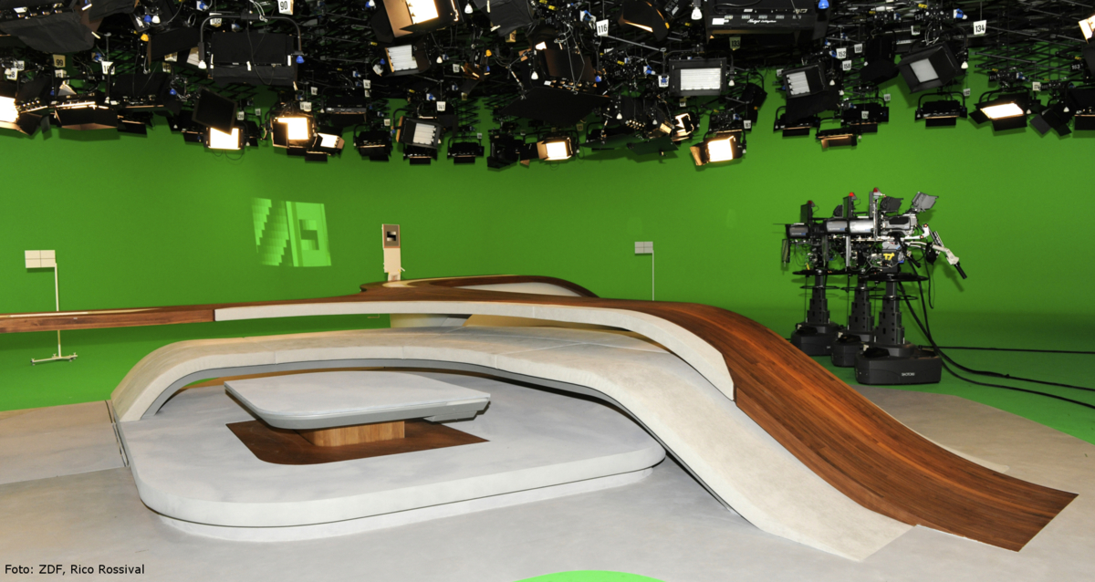 In den ZDF-Nachrichtenstudios dienen Wände als Projektionsfläche für virtuelle Grafiken. Das erfordert absolut glatte Oberflächen und einen Raum ohne jegliche Ecken und Kanten: Dreidimensionale LaArt Gips-Formteile lassen die Ecken verschwinden. Boden und Wand verschmelzen dank dieser glasfaserverstärkten abgerundeten Elemente zu einer Einheit.